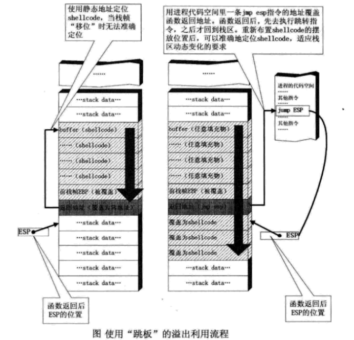 这种定位ShellCode的方法使用进程空间里的一条jmp esp 指令作为“跳板”,不论栈帧怎么移位,都能够精确的跳回栈区,从而适应程序运行中ShellCode内存地址的动态变化。