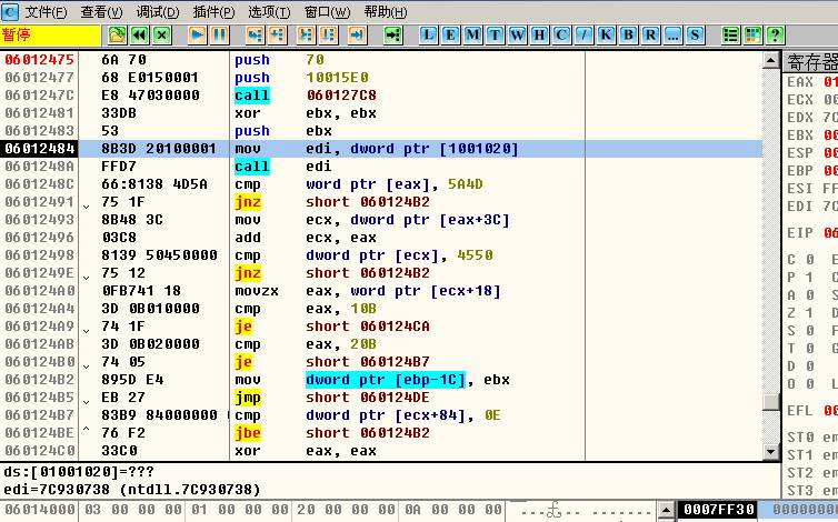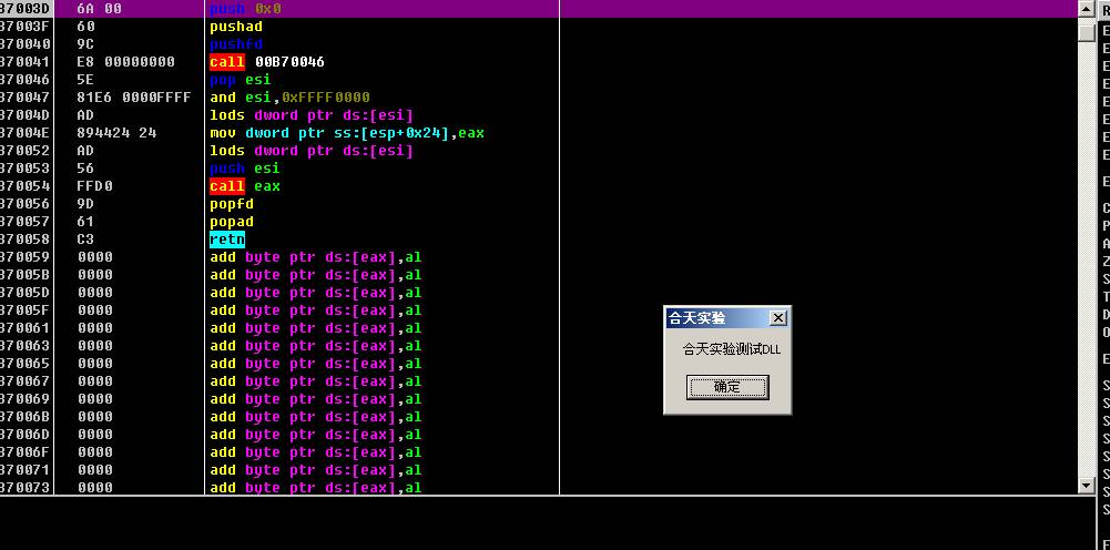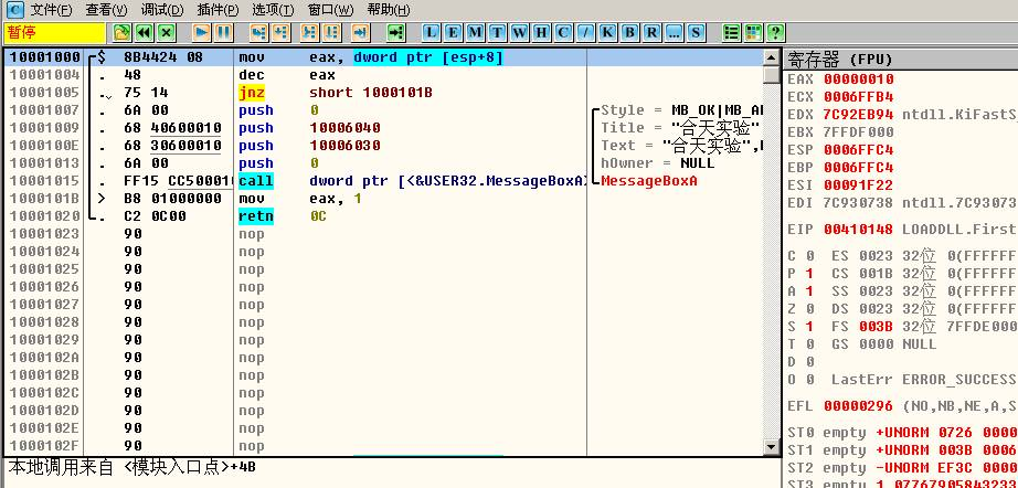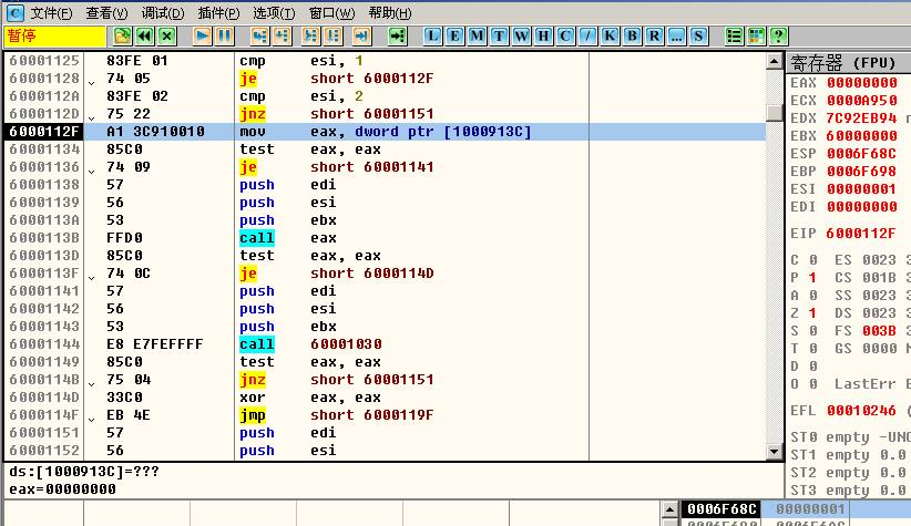 5、用OD打开修改前DLL文件,并执行。执行成功后,再加载修改后的DLL文件。