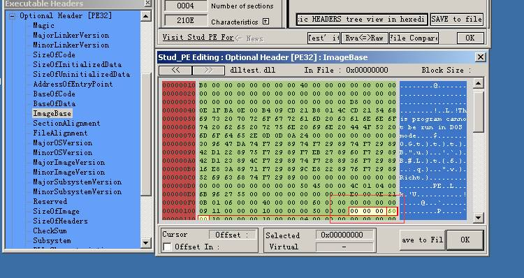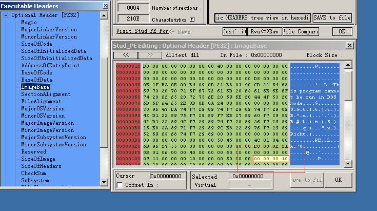 2、用stud_pe打开测试DLL文件,定位到imageBase字段。