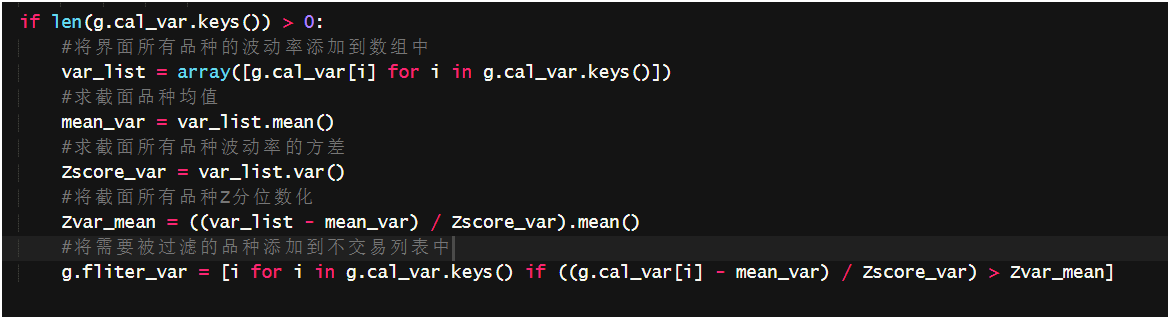 截面波动率过滤方法即,计算全市场所有品种波动率Z分位数的均值,然后用当前品种波动率的 Z 分位数和这个平均值做对比,如果波动率更大,就认为该品种目前波动率过大趋势不明,该品种就不参与交易。