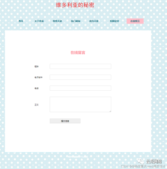 以上就是阔达背包最近收集整理的关于HTML5期末大作业:个人主页网站设计——服装明星主页(7页)表格带留言板带音乐的全部内容,更多相关HTML5期末大作业内容请搜索靠谱客的其他文章。