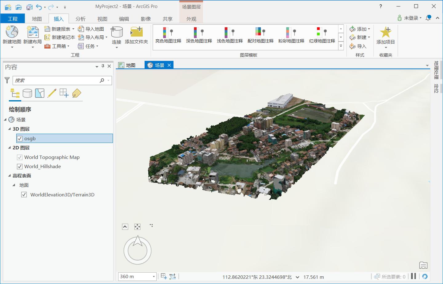 5.osgb转换完成后为slpk格式,点击插入全局场景吧slpk格式拖拽至3D图层即可浏览,并可以进行应用。