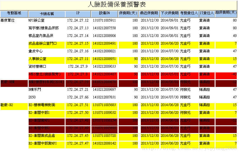系统保养预警:通过红、橙、黄三种颜色醒目管理:红色表示超过保养期10天以上,橙色表示超过保养期10天以内,黄色表示在保养期一个月之内.