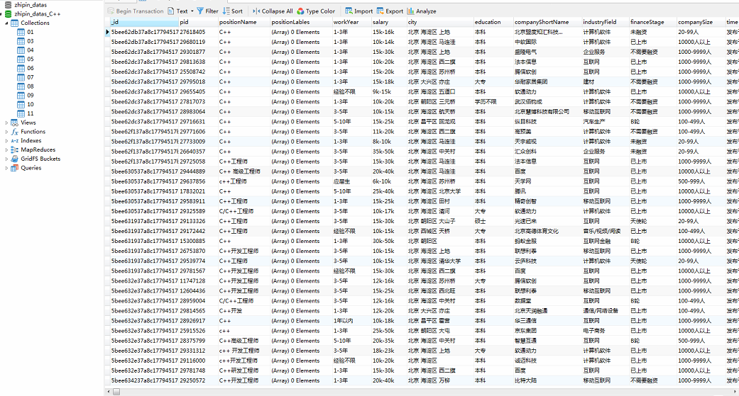 4.4、数据爬取结束后,使用gui工具Navicat 12 for MongoDB可以查看爬取到的数据,效果如下图所示
