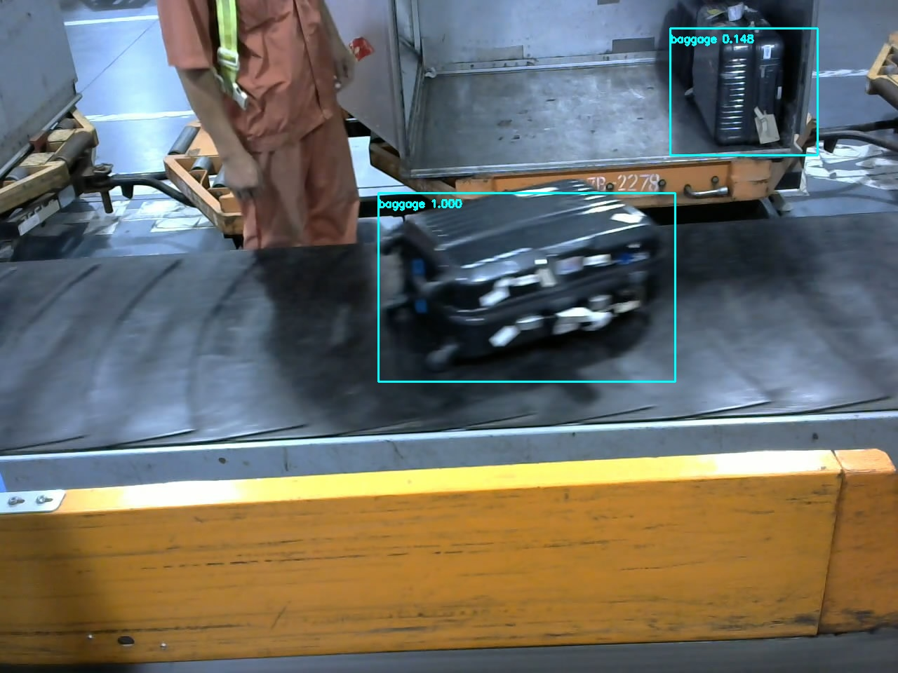 这时识别效果才会比较正常了(为何说比较正常而不说完全符合预期结果呢?因为tensorrt解析onnx后生成的engine文件在推理时的精度比直接使用pytorch调用原始的pt模型文件或者使用onnxruntime调用同一模型的onnx来识别的精度要差一些,同一图片里的同一个object的得分明显下降,这个问题去年报给NVIDIA了,但是至今还没有解决),贴个我做过的某个机场识别行李箱的例子: