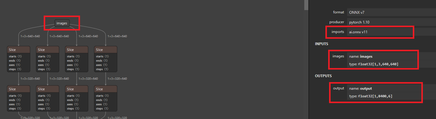 默认情况下,输入的name应该是"images",维度应该是[1, 3, 640, 640],输出的name应该是"output",维度应该是[1, 8400, 85]。