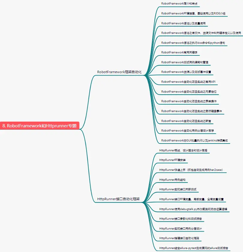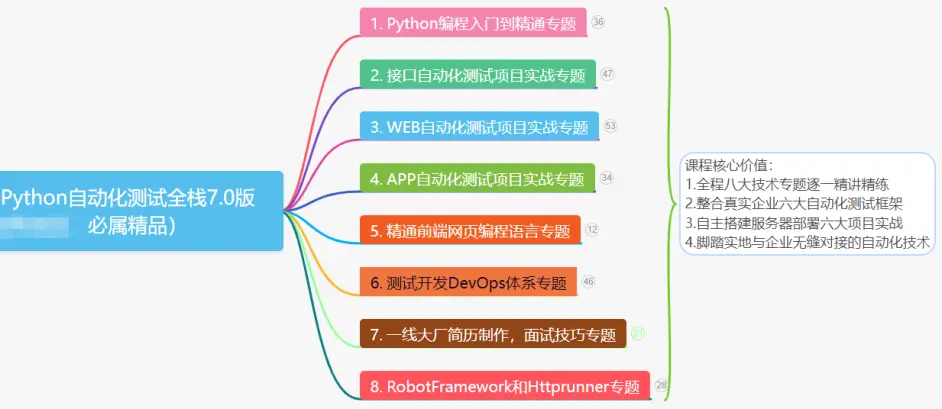 以上就是傻傻火车最近收集整理的关于最新Python自动化测试全栈资料合集(学习路线图、笔记+视频+工具+项目实战)1、学习方向Python自动化测试全栈学习路线图接下来我详细分析8大专题1.Python编程入门到精通专题2.接口自动化测试项目实战专题 3.Web自动化测试项目实战专函 4.app自动化测试项目实战专题 5.精通前端网页编程语言专题6.测试开发DevOps体系专题 7.一线大厂简历制作,面试技巧专题 8.RobotFramework和Httprunner专题以上只是学习方向,那么问题来了,怎么领取!如何学习!看的全部内容,更多相关最新Python自动化测试全栈资料合集(学习路线图、笔记+视频+工具+项目实战)1、学习方向Python自动化测试全栈学习路线图接下来我详细分析8大专题1.Python编程入门到精通专题2.接口自动化测试项目实战专题 3.Web自动化测试项目实战专函内容请搜索靠谱客的其他文章。