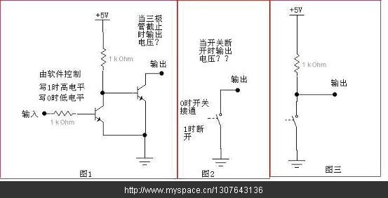 再看图三。图三中那个1K的电阻即是上拉电阻。如果开关闭合,则有电流从1K电阻及开关上流过,但由于开关闭和时电阻为0(方便我们的讨论,实际情况中开关电阻不为0,另外对于三极管还存在饱和压降),所以在开关上的电压为0,即输出电平为0。如果开关断开,则由于开关电阻为无穷大(同上,不考虑实际中的漏电流),所以流过的电流为0,因此在1K电阻上的压降也为0,所以输出端的电压就是5V了,这样就能输出高电平了。但是这个输出的内阻是比较大的(即1KΩ),如果接一个电阻为R的负载,通过分压计算,就可以算得最后的输出电压为5*R/(R+1000)伏,即5/(1+1000/R)伏。所以,如果要达到一定的电压的话,R就不能太小。如果R真的太小,而导致输出电压不够的话,那我们只有通过减小那个1K的上拉电阻来增加驱动能力。但是,上拉电阻又不能取得太小,因为当开关闭合时,将产生电流,由于开关能流过的电流是有限的,因此限制了上拉电阻的取值,另外还需要考虑到,当输出低电平时,负载可能还会给提供一部分电流从开关流过,因此要综合这些电流考虑来选择合适的上拉电阻。