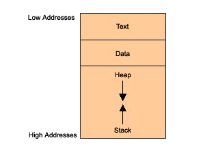 紧接着Data段的一块内存是由堆和栈共享的区域。堆向下(高地址)增长,栈向上(低地址)增长。