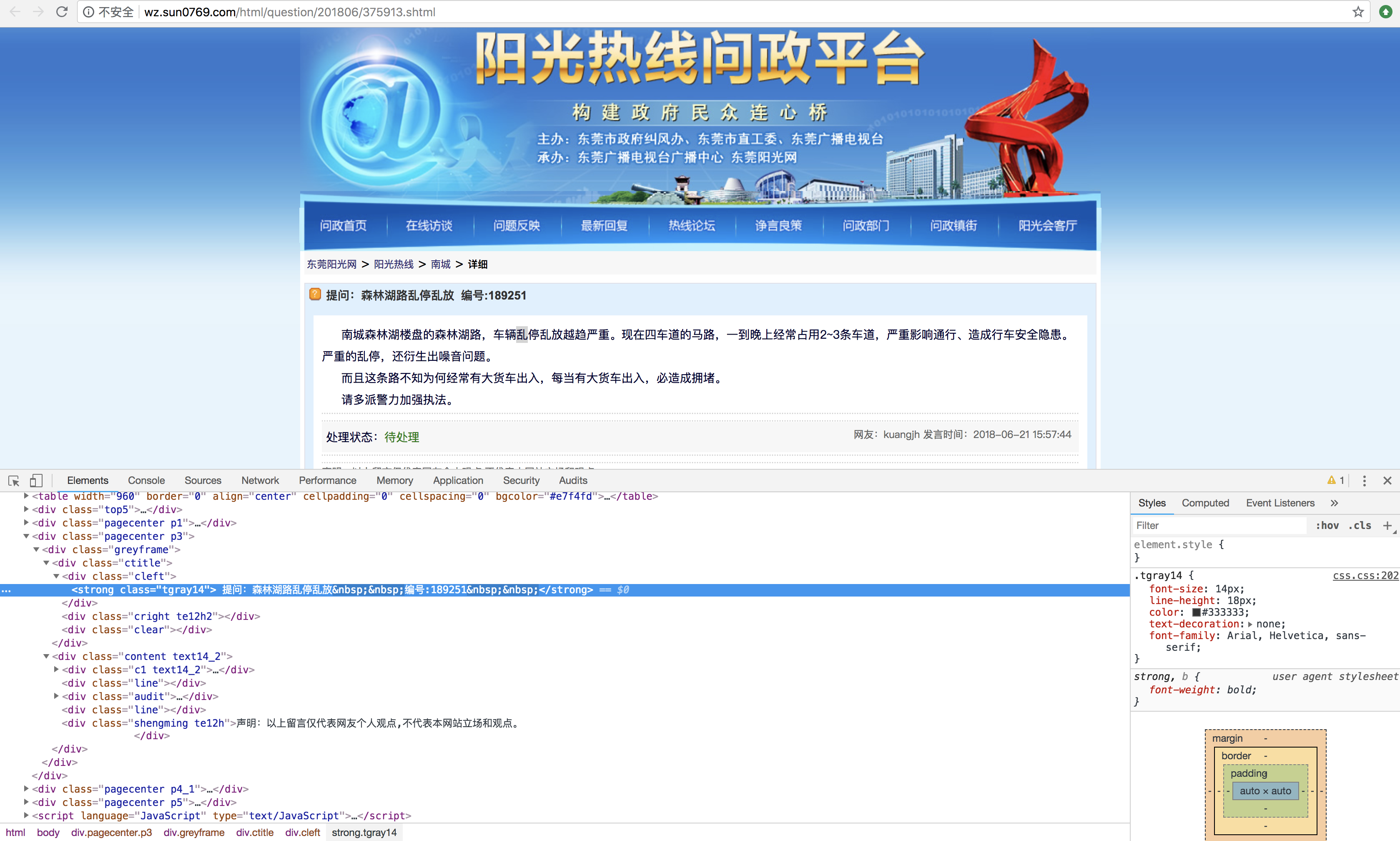 1 >>> response.xpath('//div[@class="c1 text14_2"]/text()').extract()[0] 2 'xa0xa0xa0xa0 南城森林湖楼盘的森林湖路,车辆乱停乱放越趋严重。现在四车道的马路,一到晚上经常占用2~3条车道,严重影响通行、造成行车安全隐患。严重的乱停,还衍生出噪音问题。' 3 >>> response.xpath('//div[@class="c1 text14_2"]/text()').extract() 4 ['xa0xa0xa0xa0 南城森林湖楼盘的森林湖路,车辆乱停乱放越趋严重。现在四车道的马路,一到晚上经常占用2~3条车道,严重影响通行、造成行车安全隐患。严重的乱停,还衍生出噪音问题。', 'xa0xa0xa0xa0 而且这条路不知为何经常有大货车出入,每当有大货车出入,必造成拥堵。', 'xa0xa0xa0xa0 请多派警力加强执法。'] 5 >>>