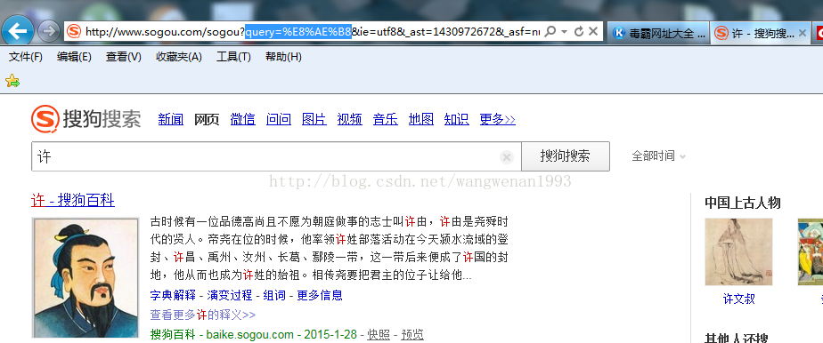 首先可以在浏览器中输入想要的汉字,然后回车,可以在弹出页面的地址栏中url找到一个参数,下面以IE为例,我输入的是“许” 可以看到“query=%E8%AE%B8”这样一个字段