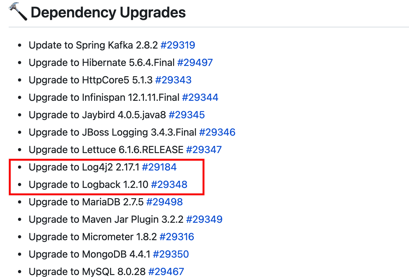 所以,这次的 Spring Boot 发版除了日常的 bug 修复、文档优化改进。依赖升级等,大家还需要重点关注 Log4j2 & Logback 的漏洞版本升级: