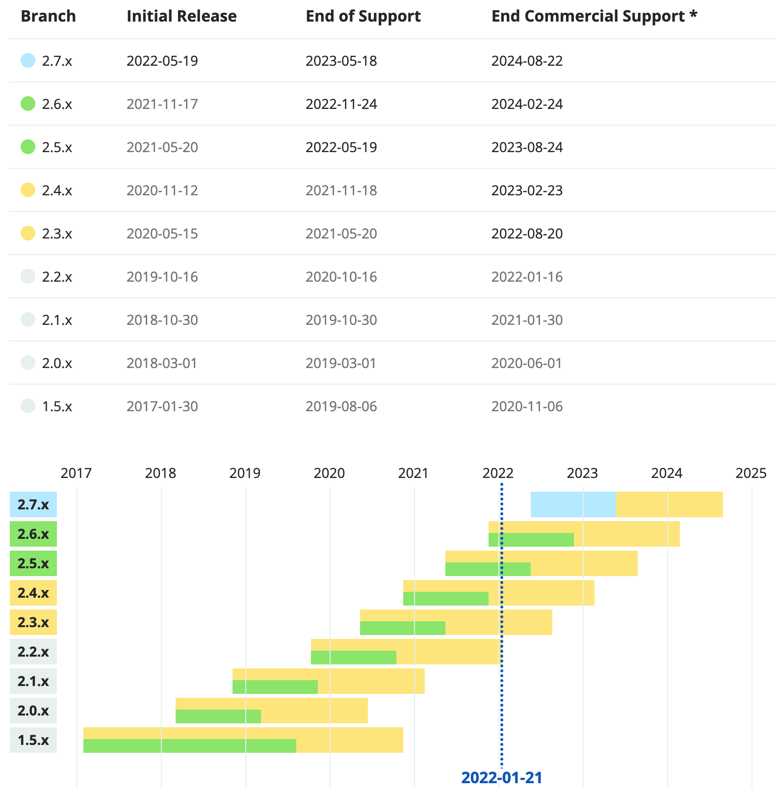 可以看到,绿色的是正在继续维护的,是安全的,橙色的只提供商业支持了,灰色的不提供任何支持了。