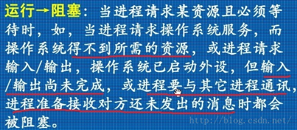 - 阻塞/等待状态(Blocked):进程正在等待某个资源(如打印机、独占式资源)或等待I/O完成而暂停运行