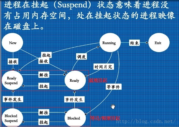 因为挂起状态的设立时为了节约内存空间。那么上图中,首先应该是让那些需要等待事件的“等待/阻塞状态”从内存中释放,变成“等待/阻塞挂起”状态。如果内存还不够用,再考虑将“就绪状态”的进程从主存中挪到磁盘中去,变成“就绪挂起”状态。