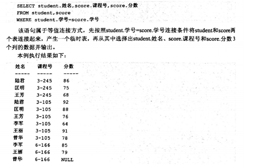 (1)等值连接:表之间通过一个“等于”关系连接起来,产生一个连接临时表,然后对表进行处理产生最终的结果