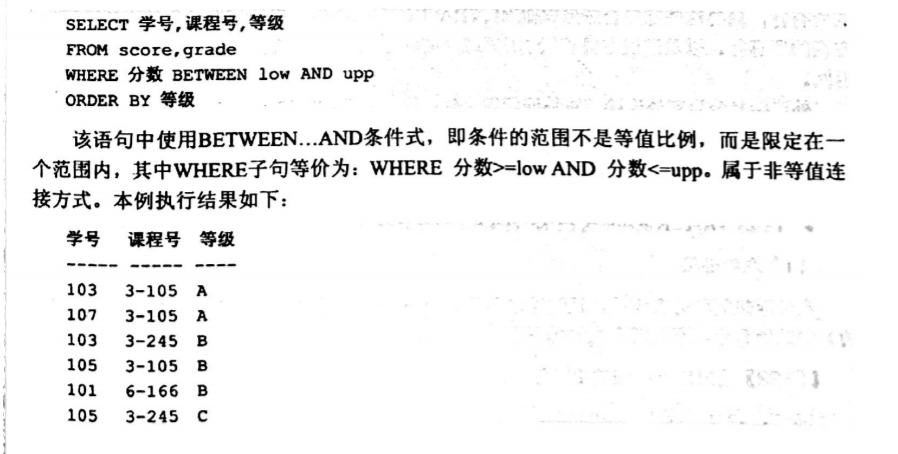(2)非等值连接:表之间的关系不是等值关系而是其他关系,通过指定的非等值关系,将两个表连接起来,产生一个临时表,然后对该临时表进行处理后生成最终的结果