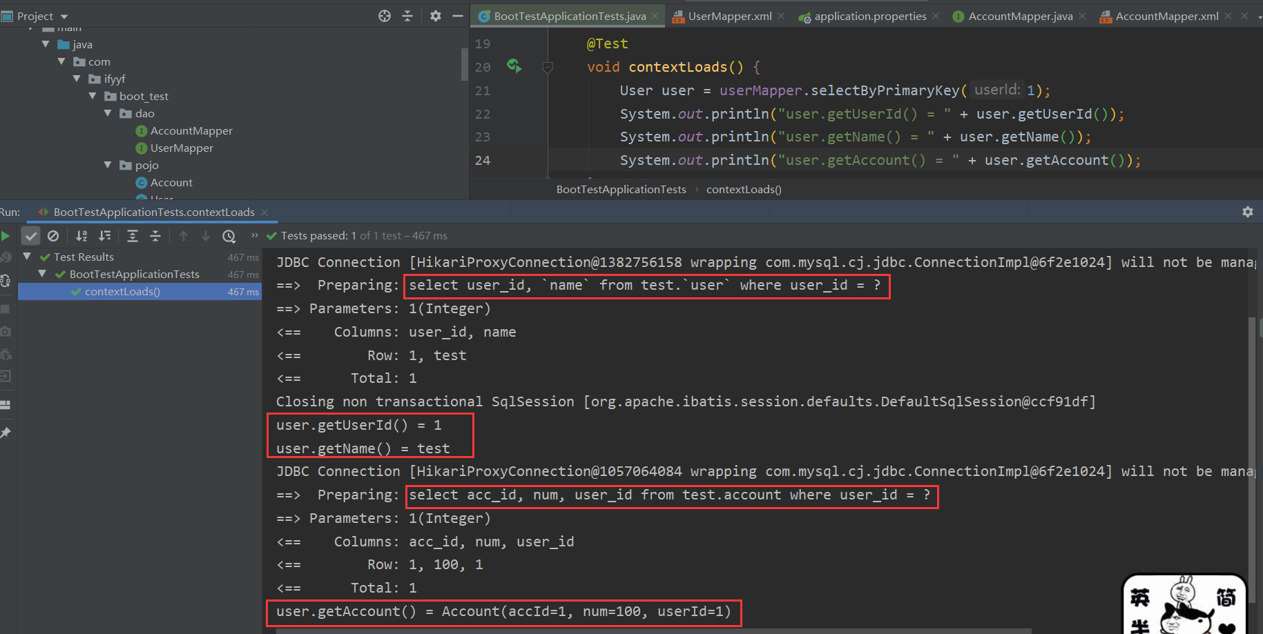 System.out.println("user.getAccount() = " + user.getAccount());时发现user.getAccount()为null,然后又去执行了一次select * from account where user_id = ? - 然后将查询出来的account结果set进了user,即