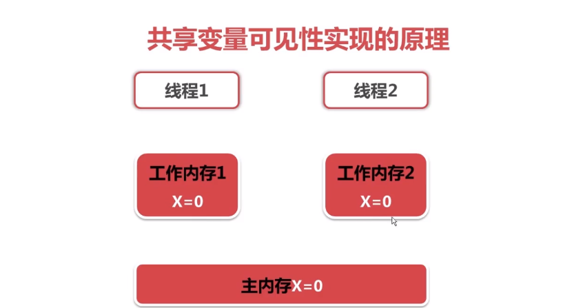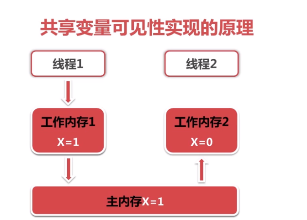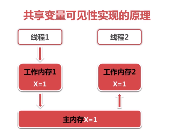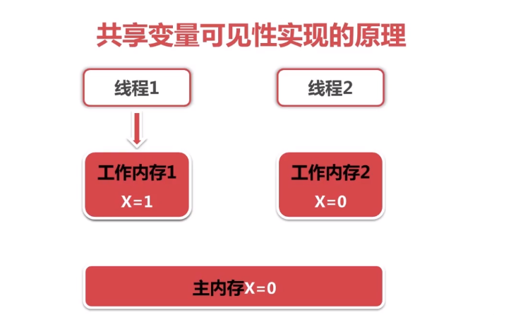 (附:上述过程实现了共享变量x再线程1和线程2中的可见性。实现可见性实际上是两部,更新到主内存,然后再到工作内存2中,为了更容易理解,分开描述)