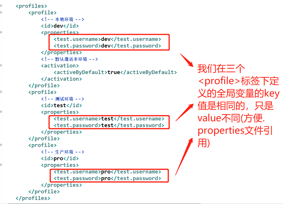 一般,我们在各个<profile>中定义的全局变量的<key>值是相同的,只是value不同,如代码: