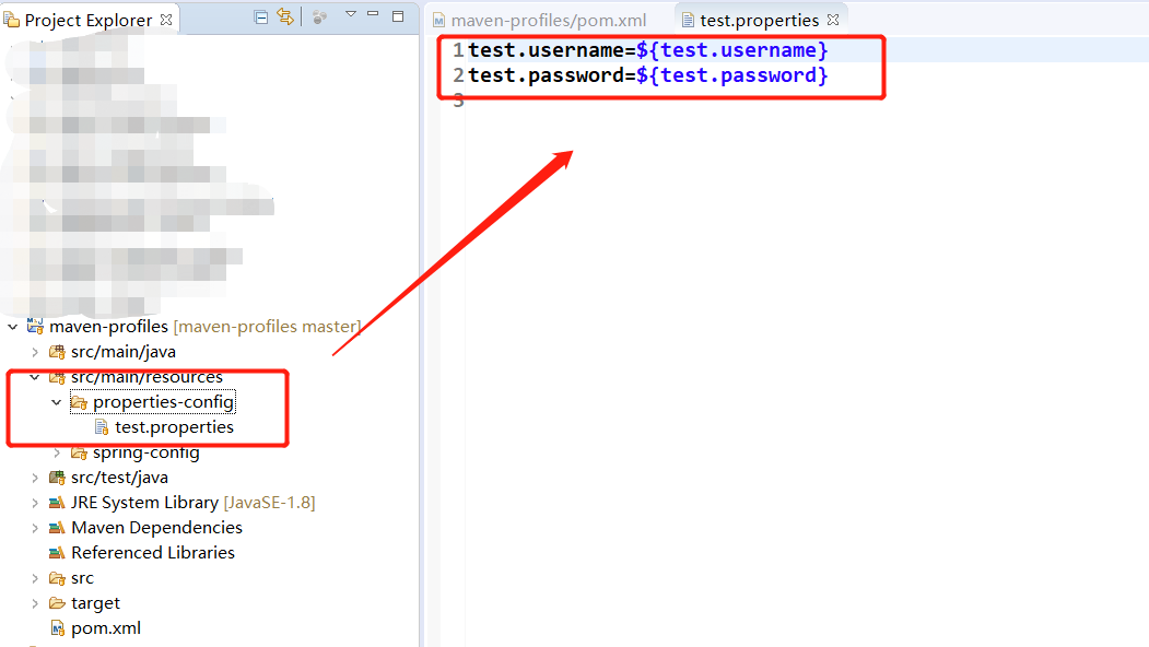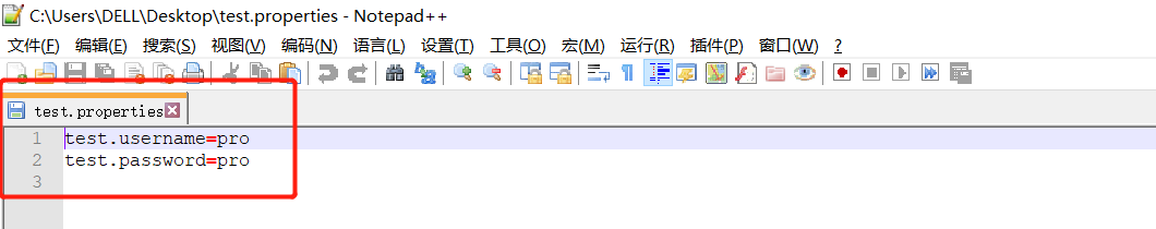 切换到项目根目录下,使用mvn clean package -P pro命令打包,用解压器打开打包之后的jar包(jar包位于项目根目录下的target目录下),观察test.properties文件,如下: