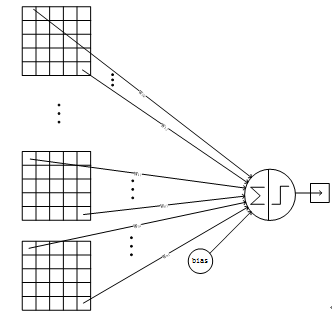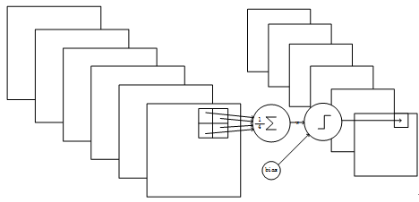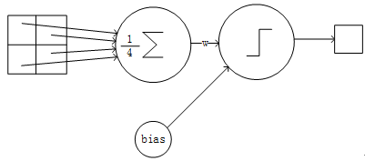 下抽样层采用的是2x2的输入域,即上一层的4个节点作为下一层1个节点的输入,且输入域不重叠,即每次滑动2个像素,下抽样节点的结构见Figure 6。每个下抽样节点的4个输入节点求和后取平均,均值乘以一个参数加上一个偏置参数作为激活函数的输入,激活函数的输出即是下一层节点的值。一个下抽样节点只有2个训练参数。