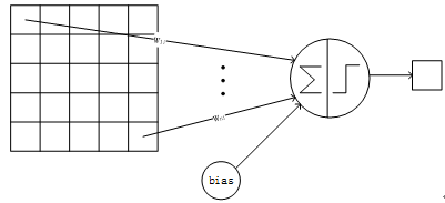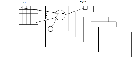 卷积层采用的都是5x5大小的卷积核,且卷积核每次滑动一个像素,一个特征图谱使用同一个卷积核(即特征图谱内卷积核共享参数),卷积核的结构见Figure 5。每个上层节点的值乘以连接上的参数,把这些乘积及一个偏置参数相加得到一个和,把该和输入激活函数,激活函数的输出即是下一层节点的值。卷积核有5x5个连接参数加上1个偏置共26个训练参数。这样局部连接、参数共享的方式,在数学上相当于上一层节点矩阵与连接参数矩阵做卷积得到的结果矩阵,即下一层的节点值,这是卷积神经网络名字的由来。Figure 6显示了卷积神经网络连接于矩阵卷积的对应关系: