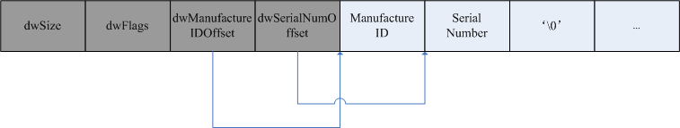 接着从图中可以知道,在紧随着结构体之后的是ManufactureID和SerialNumber的数值。那么这两个数值的位置应该如何确定呢?那就是通过dwManufactureIDOffset和dwSerialNumOffset的数值来确定,这也就是为什么图中dwManufactureIDOffset方块延伸出来的箭头会指向ManufactureID前端的原因。