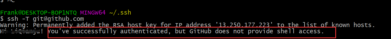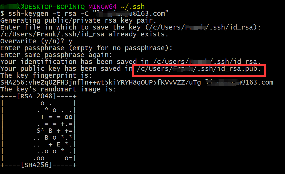 Enter file in which to save the key (/c/Users/Frank/.ssh/id_rsa):回车