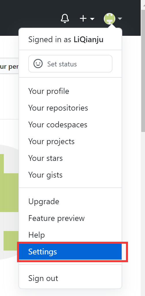 5.复制记事本中的内容,打开github主页,在右上角头像下拉框中选setting。