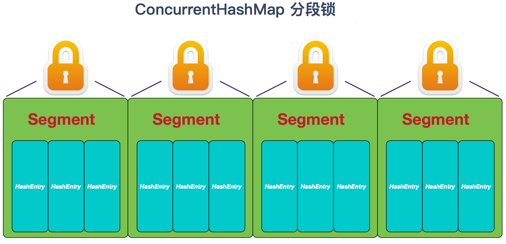 ①.解决问题:HashTable性能差主要是由于所有操作需要竞争同一把锁,而如果容器中有多把锁,每一把锁锁一段数据,这样在多线程访问时不同段的数据时,就不会存在锁竞争了,这样便可以有效地提高并发效率。这就是ConcurrentHashMap所采用的"分段锁"思想。