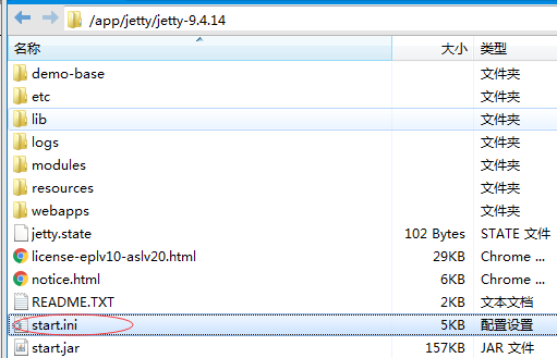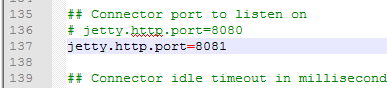 编辑这个文件,里面有一行注释掉的jetty.http.port=8080,表示默认是8080端口,我们加一行在下面,设置你的端口