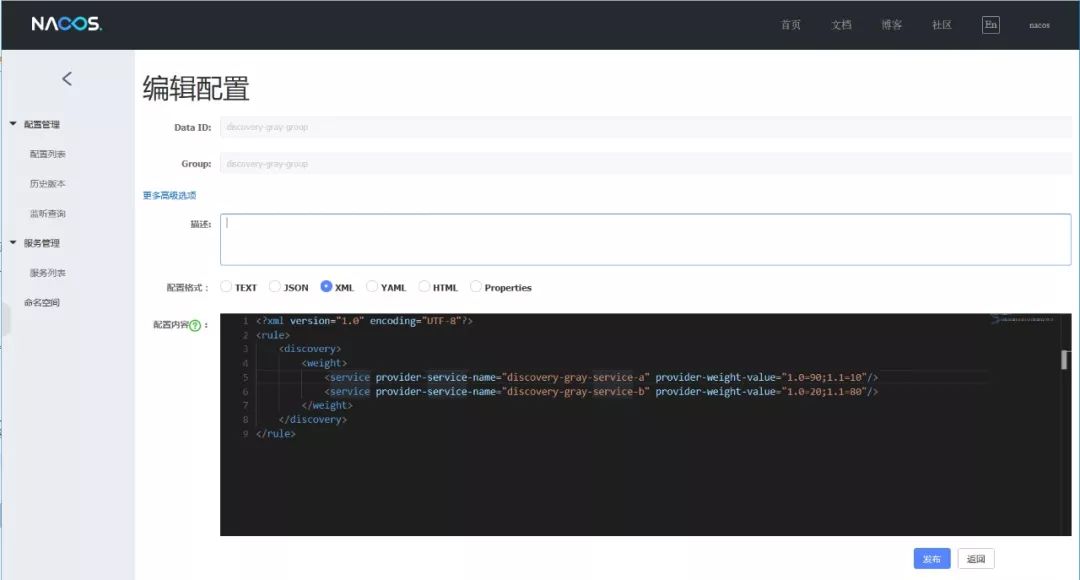 增加服务权重的灰度规则,Group为discovery-gray-group,Data Id为discovery-gray-group(全局发布,两者都是组名),规则内容如下,实现a服务1.0版本提供90%的流量,1.1版本提供10%的流量;b服务1.0版本提供20%的流量,1.1版本提供80%的流量: