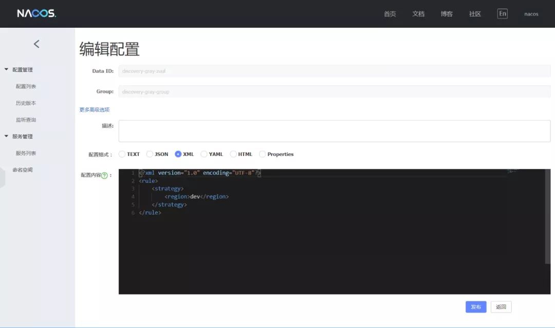 增加Zuul的基于区域路由的灰度规则,Group为discovery-gray-group,Data Id为discovery-gray-zuul,规则内容如下,实现从Zuul发起的调用都走区域为dev的服务: