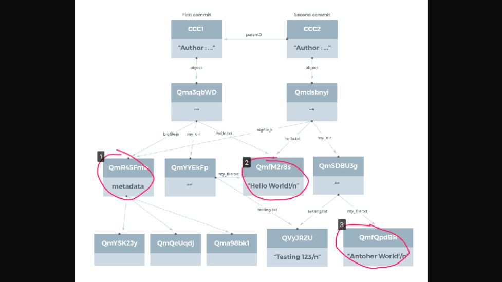 我们看在左边first commit 中的mydir 窒息那个的 my file 就是2 的内容有修改,到second commit my dir的hash产生了改变因为下面的文件内容变了。同时指向了相同的testing.txt 因为内容没有改变。 指向了新的 my_file 文件。