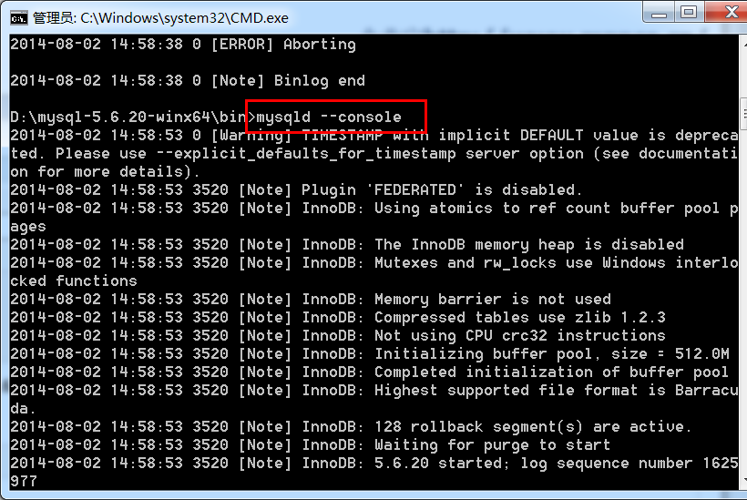 4.CMD下面尝试启动mysqld,并将后台log输出在屏幕。
