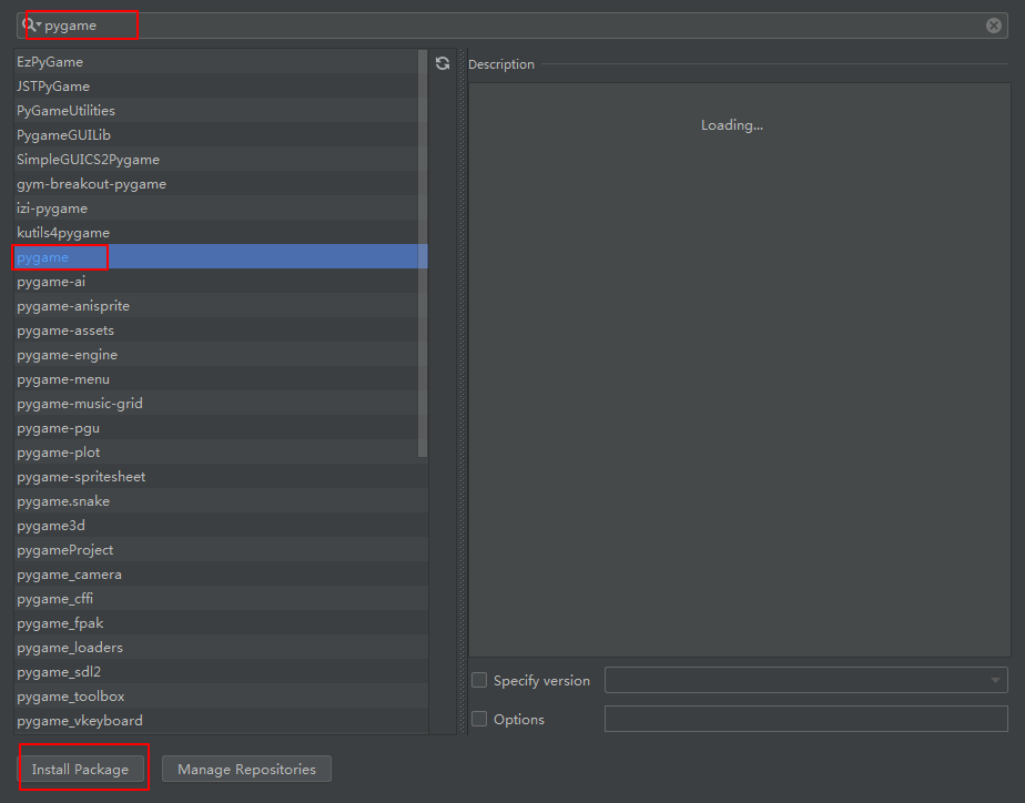 点击加号,搜索pygame