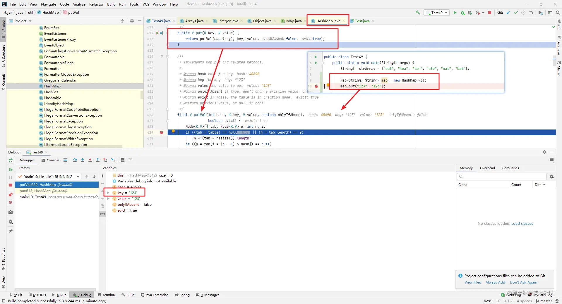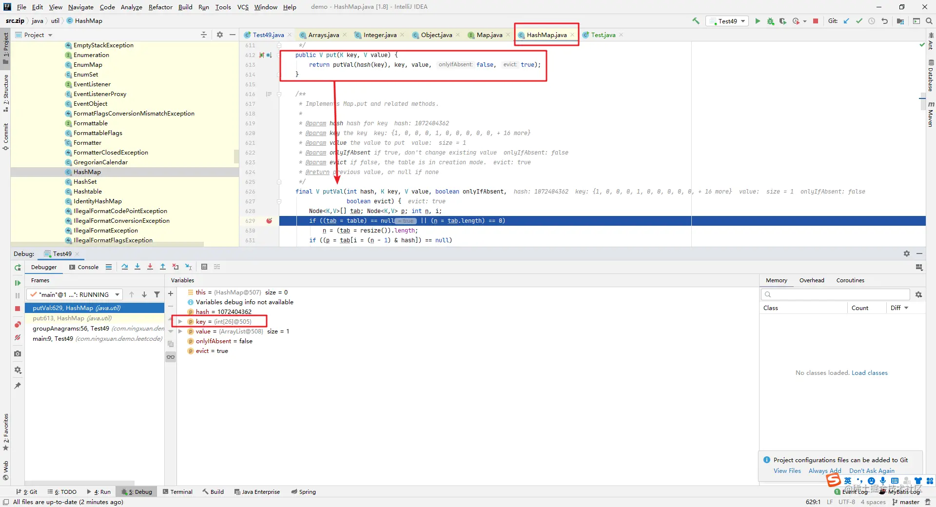 那么问题来了,为什么我们的 array数据结构都一致,但是在 map.put时计算出来的hash不一致呢,于是我打了个断点到 HashMap的源码里面看到了以下的情况