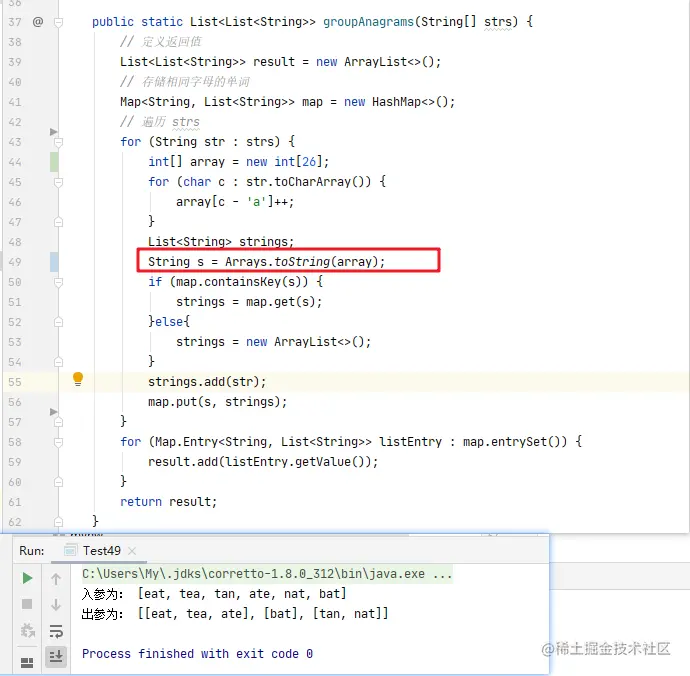 - LeetCode 49题建议使用 Arrays.sort()方法对字符串转成的 char[]进行重新排序,测试代码如下图