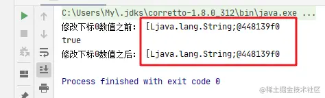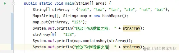 为了验证我们的想法,我对齐进行了验证,在不改变原有对象的情况下去改变数组的值,发现他们的哈希值是一样的,这也验证了我们的 Map.put方法中, key哈希值的计算是依赖于对象的 toString方法的