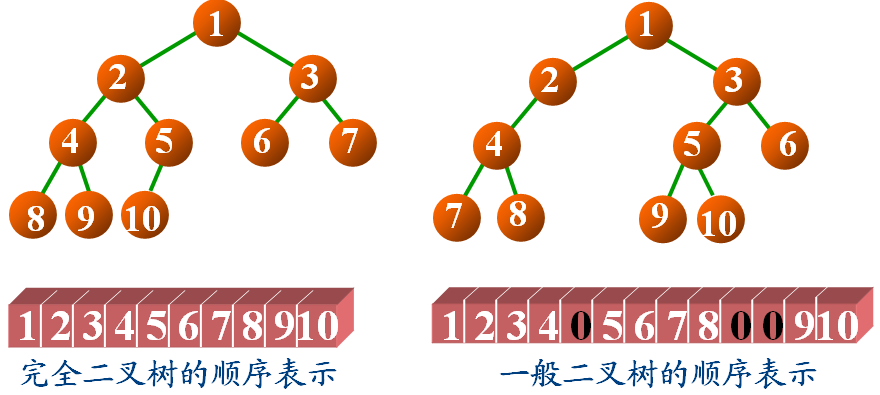 从上图可以看出,右边的是一颗普通的二叉树,当它与左边的完全二叉树对比,发现它比完全二叉树少了第5号结点,所以在数组中用0表示,同样它还少了完全二叉树中的第10、11号结点,所以在数组中也用0表示。结点存储的数据均为非负整数