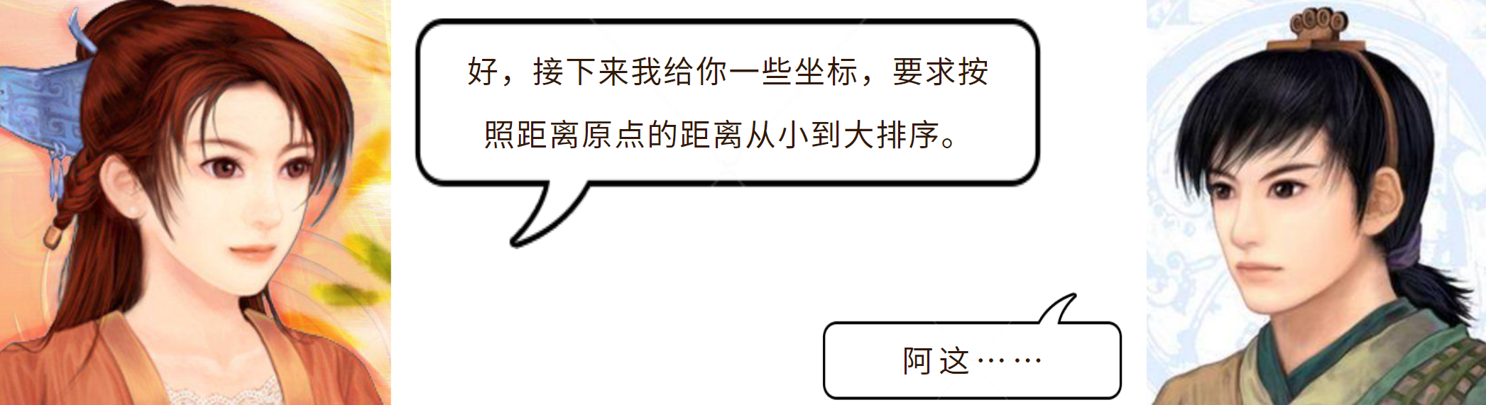 【例题6】给定 n ( 2 ≤ n ≤ 1000 ) n(2 le n le 1000) n(2≤n≤1000),然后给出 n n n 个整数坐标 ( x i , y i ) (x_i, y_i) (xi,yi),坐标范围 ( − 100 < x i , y i < 100 ) (-100 < x_i, y_i < 100) (−100<xi,yi<100),求将坐标按照离原点距离从小到大输出。