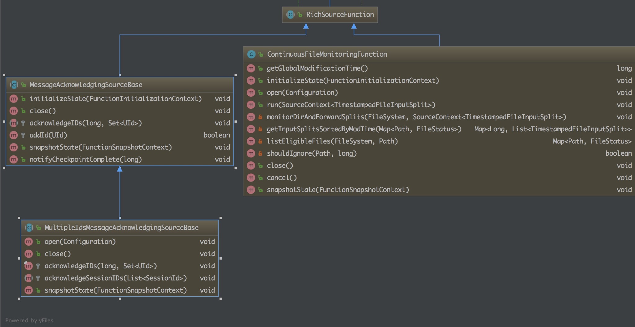一个抽象类,继承自 AbstractRichFunction。为实现一个 Rich SourceFunction 提供基础能力。该类的子类有三个,两个是抽象类,在此基础上提供了更具体的实现,另一个是 ContinuousFileMonitoringFunction。