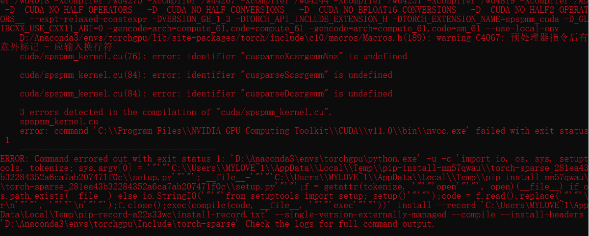 在用pip install命令安装torch_sparse、torch_cluster、torch_scatter过程中出现大段红字报错