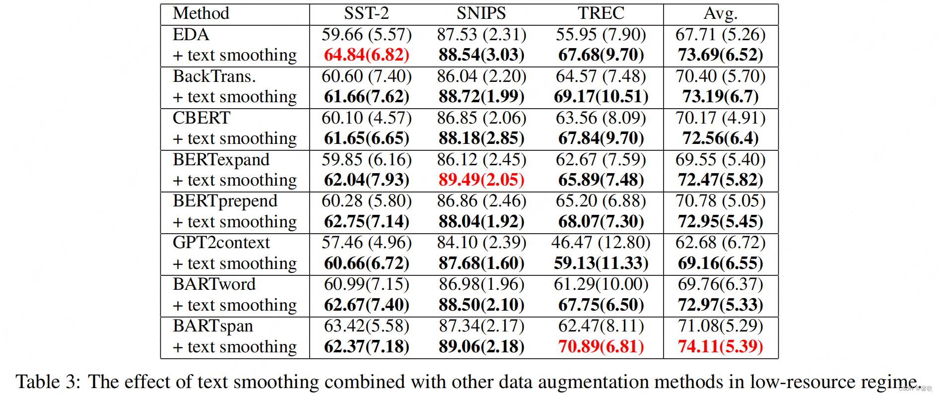 事实胜于雄辩,同时,作者为了评估文本平滑和其他数据增强方法(EDA、Back translation、CBERT、BERTexpand、BERTprepend、GPT2context、BARTword、BARTspan)的效果对比,专门在三个分类基准上使用低资源设置进行实验。在所有实验中,文本平滑都比其他数据增强方法取得了更好的性能。此外,还发现文本平滑可以与其他数据增强方法相结合,以进一步改进任务。
