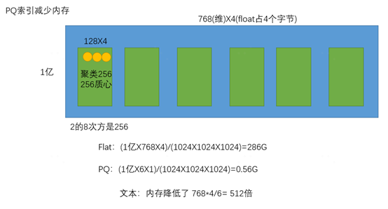 最后通过PQ索引操作之后内存使用则大大降低,相当于原来需要286G=(1亿X768X4)/(1024X1024X1024),现在仅需要0.56G=(1亿X6X1)/(1024X1024X1024),内存占用仅为原来的1/512。从单条样本占用内存的角度来看就是原来一条样本需要768X4字节,现在把一条样本拆分到6个子矩阵中,并且每个子矩阵通过1个字节来表示,就变成了6X1字节。