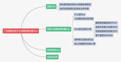 本篇主要介绍实际广告搜索业务中经常使用的大规模检索利器Faiss。首先是背景介绍,主要讲了相似度匹配任务和大规模检索算法以及如何应用到我们的实际业务场景;然后重点介绍了faiss,包括什么是faiss、大规模检索任务流程、faiss索引类型介绍、各种索引优缺点对比以及线上构建索引经验分享;最后项目实践了faiss。希望对在海量高维向量空间进行大规模检索任务感兴趣的小伙伴有所帮助。