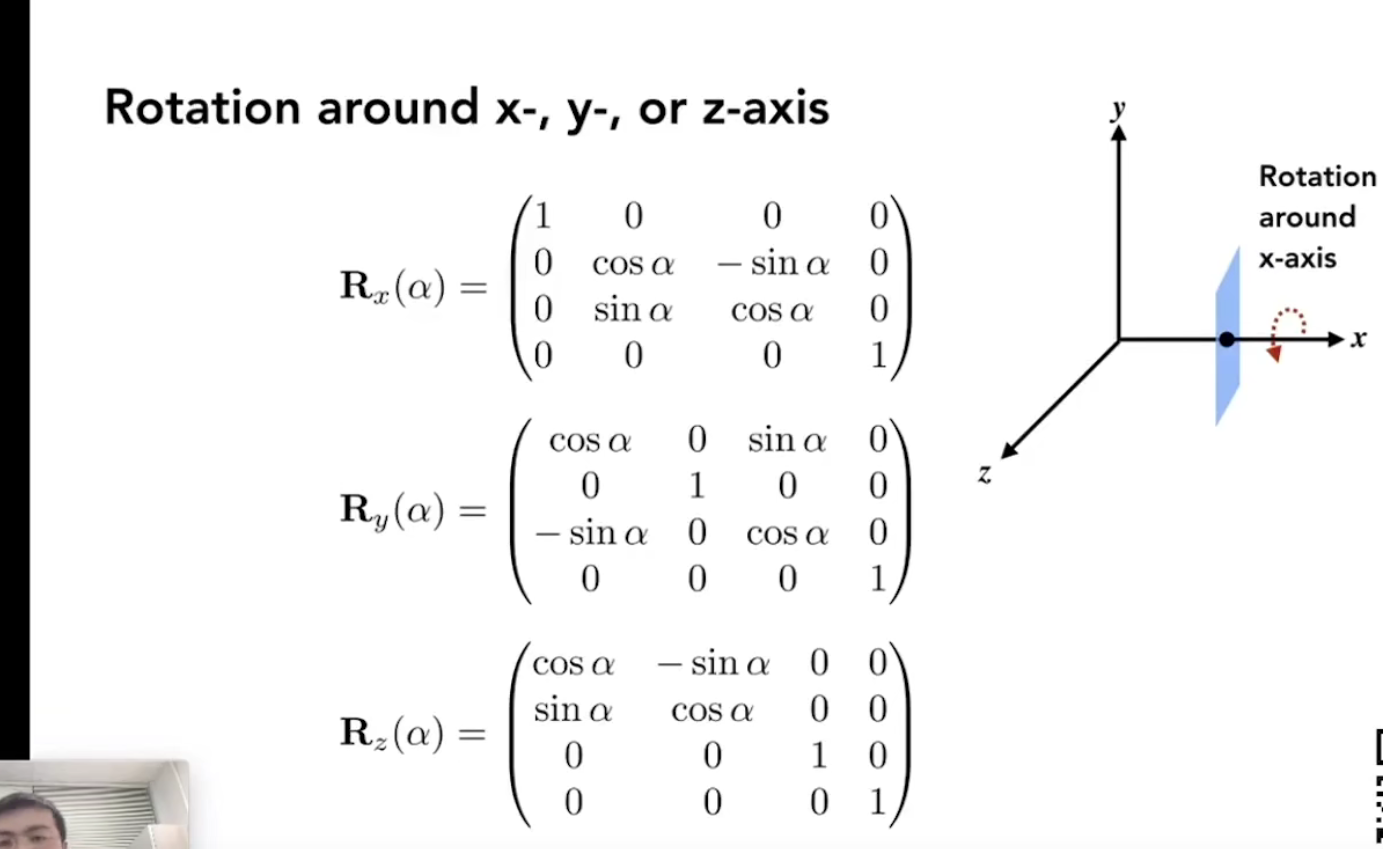 对于复杂的旋转,我们可以将它分解为三个旋转的叠加:绕x轴,绕y轴,绕z轴