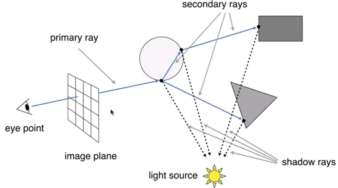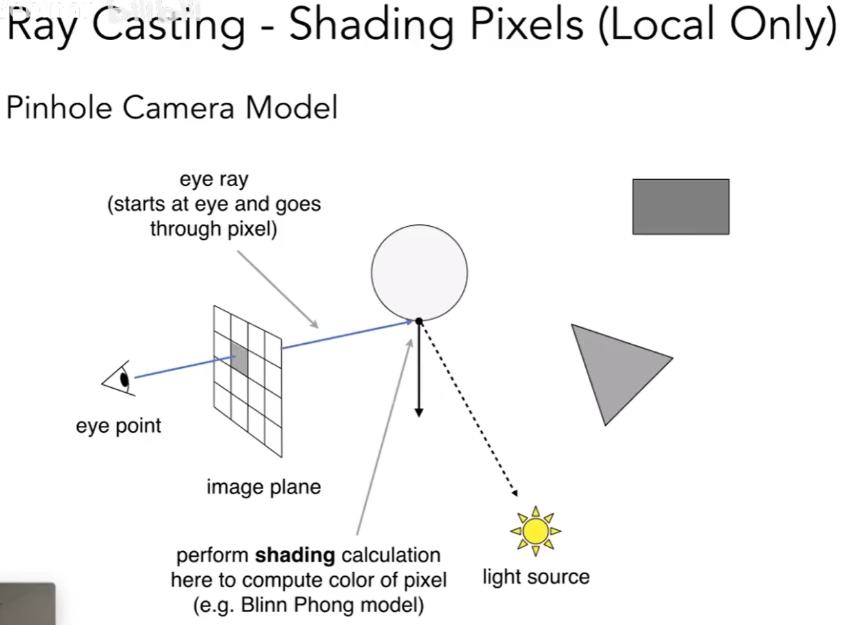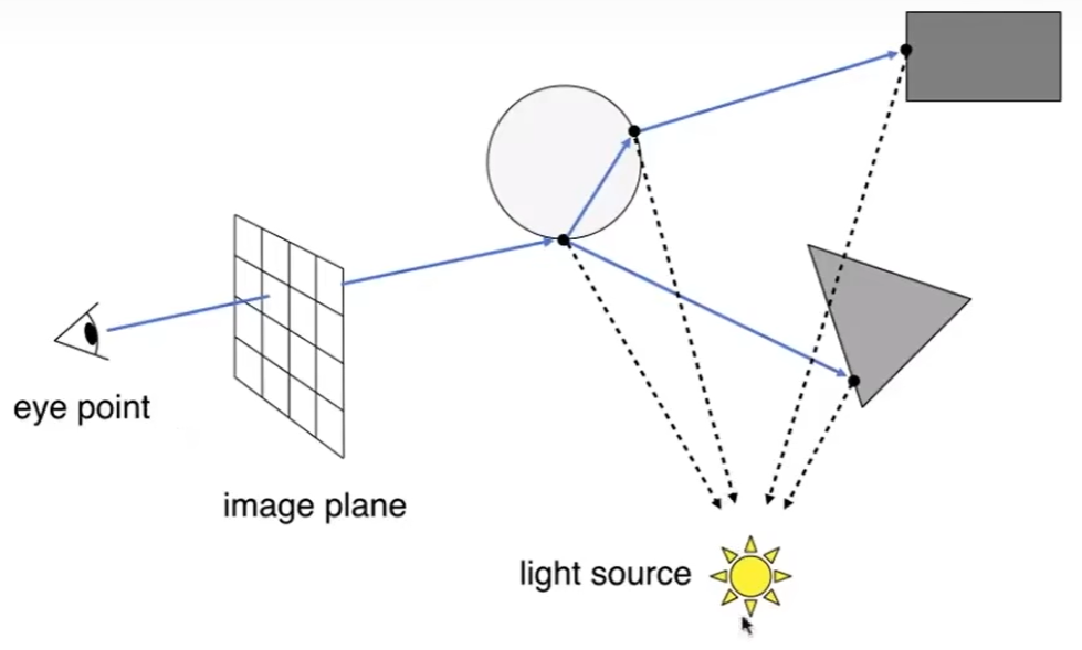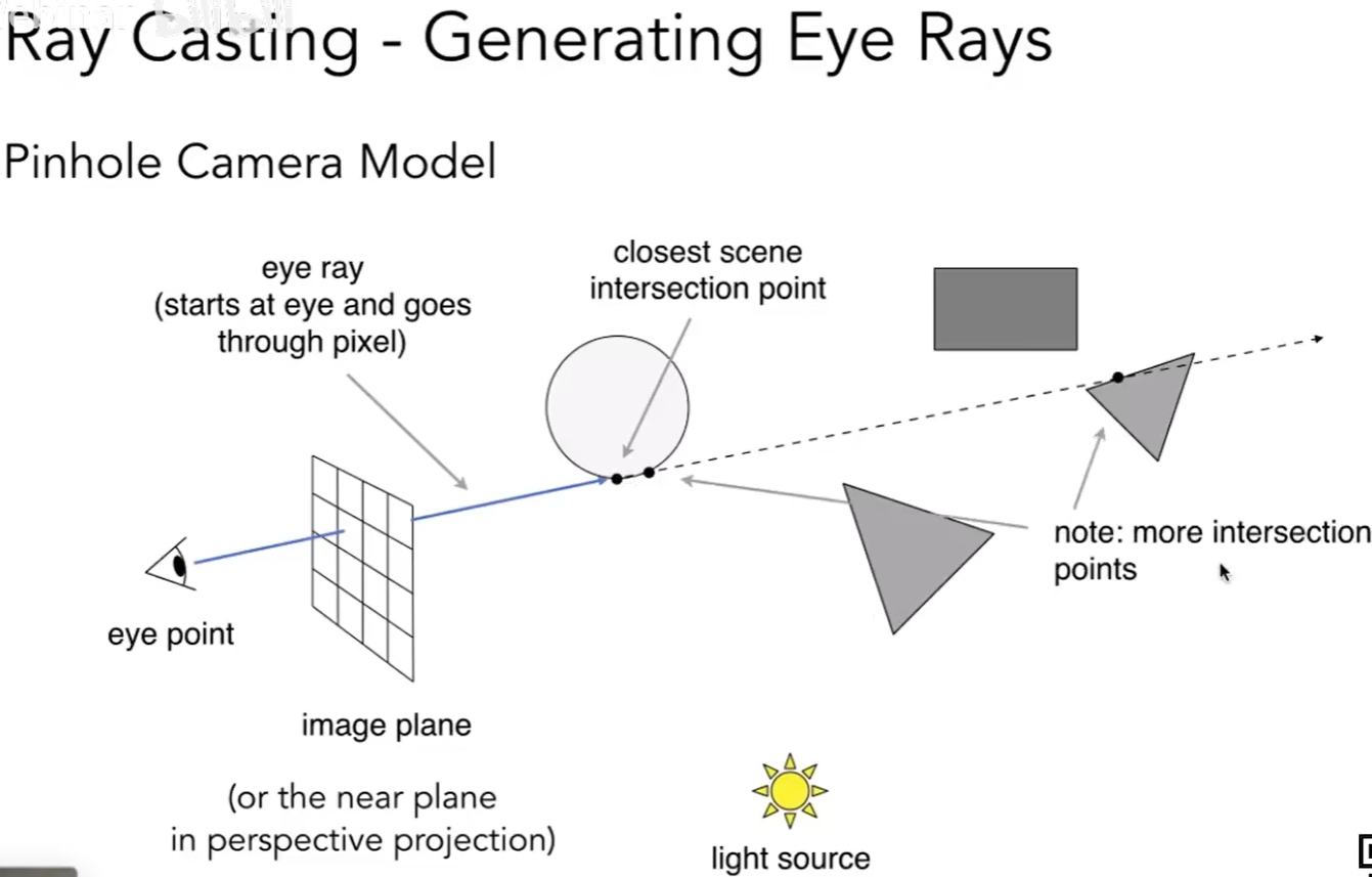 ① 生成一个在摄像机面前的图, 这个图由很多像素组成, 从摄像机出发, 经过某个指定像素, 射向场景中的某个点.