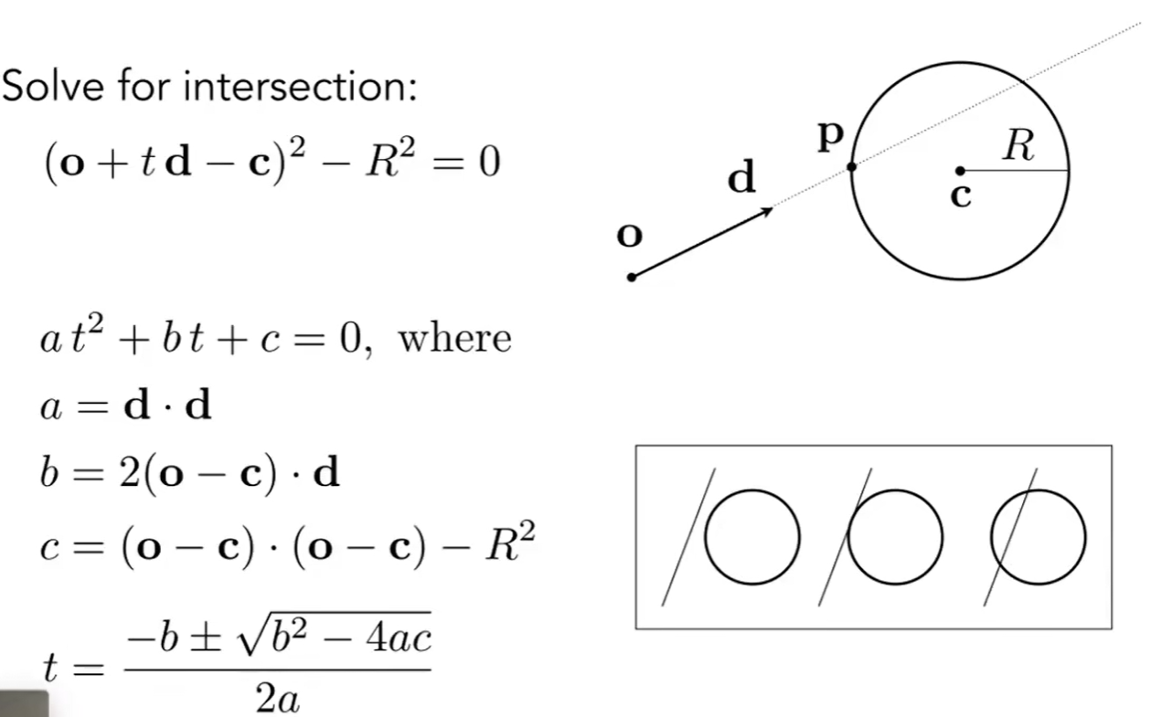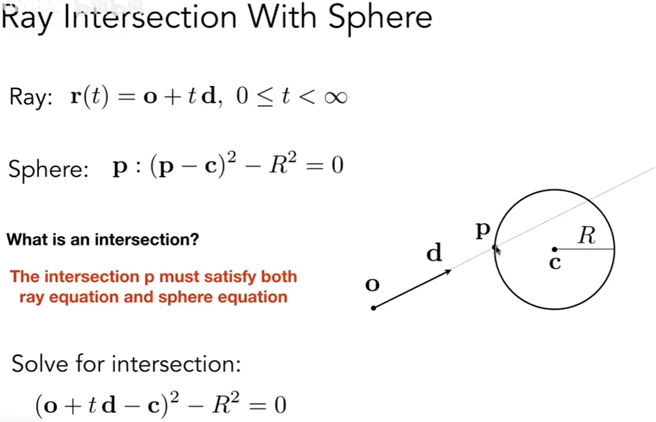 数学上, 交点p必须同时满足射线方程和球面方程